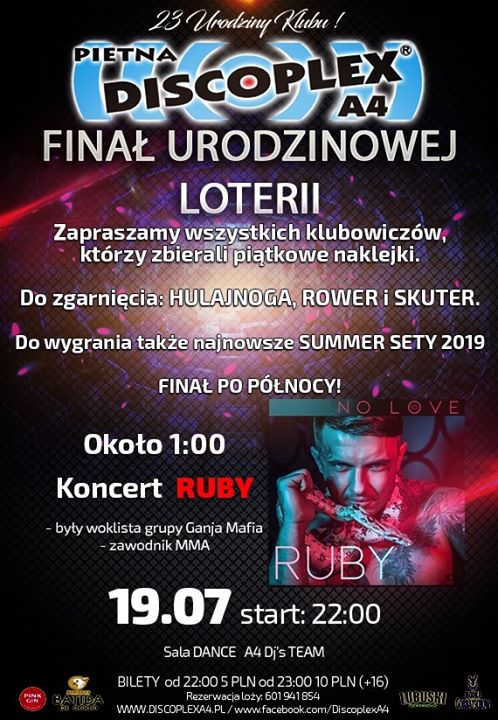 ★23 Urodziny A4 Dzień 1★Finał loterii★ Koncert Ruby★ Night4U 6 lat temu Kiedy 19.07.2019 - 20.07.2019 22:00 - 04:00 Dodaj do kalendarza Pobierz ICS Kalendarz Google iCalendar Office 365 Outlook Live Gdzie Discoplex A4 Region opolskie 23 URODZINY DISCOPLEX A4 Zapraszamy na 1 Dzień urodzinowego weekendu! No related posts.