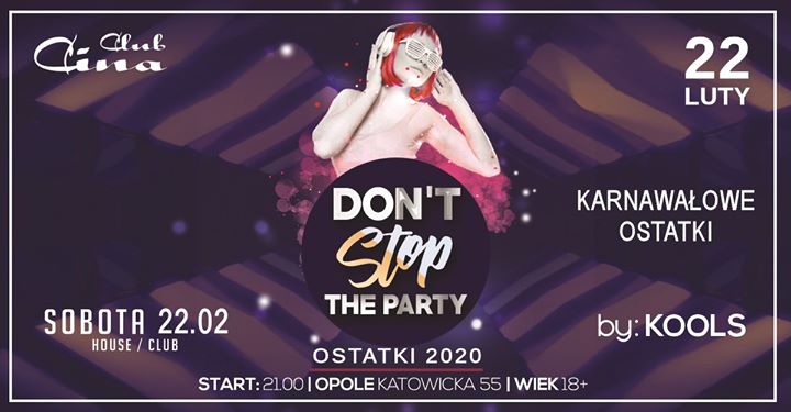 Don’t stop the party – w sobotnią noc nie przestajemy nawet na chwilę, a nasza impreza trwa bez końca! Imprezę poprowadzi gość specjalny – DJ KØØLS, który przygotował dla Was karnawałowy zestaw muzyczny: house, club, radio hits.