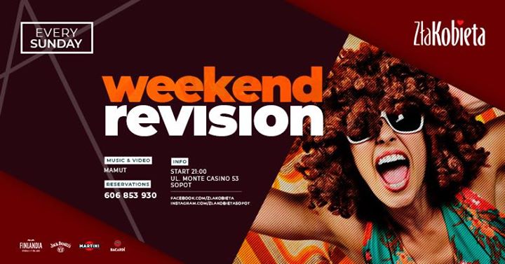 Weekend nie kończy się w sobotę, świat nie kończy się w niedzielę. Wpadnijcie na Revision, świętujcie wigilię poniedziałku. Ze Złą skończycie tydzień na luzie i ze spokojem. Z drinkiem w ręku, plecami na sofie, stopami na parkiecie. W tle będzie tlił się funkujący beat od Mamuta, a bar będzie mienił się barwami trunków. Czego więcej potrzeba do szczęścia?