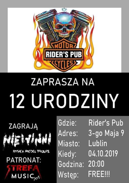 Minął kolejny rok więc mamy zaszczyt zaprosić Was kochani na DWUNASTE już urodziny naszego RIDER’SA 🙂🎂 Jest to nasze wspólne święto bo bez Was już dawno by RIDER’SA nie było więc mamy nadzieję, że nie zabraknie nikogo kto choć trochę uważa to miejsce za SWOJE 😀 Zagrają dla nas NIEWINNI 🎙️🎸 Oczywiście wjazd free 🙂
