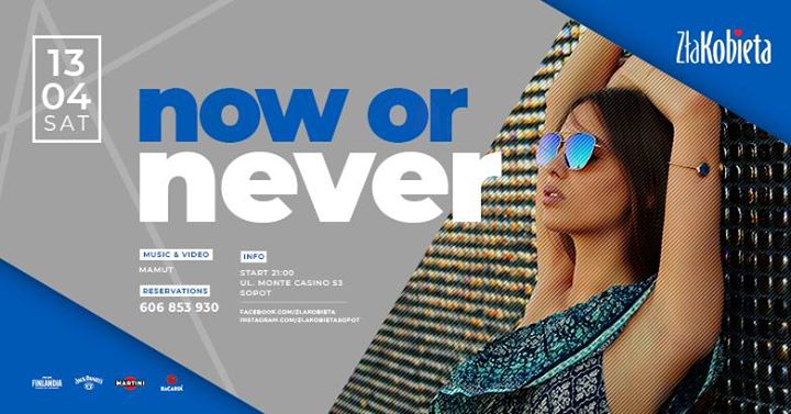 Uwaga, uwaga. Zła Kobieta ogłasza imprezowy alarm. Teraz albo nigdy! Łapiemy chwilę i bawimy się tak, jakby jutra miało nie być. Czerpiemy z imprezy garściami, pełnymi szklankami i okrągłymi piruetami na parkiecie. Lejemy do końca, aż po brzegi, i zapętlamy bity w nieskończoność. Robimy to teraz, bo jak nie dzisiaj, to kiedy? Nikt za nas tego nie zrobi. Now or Never party jest w naszych rękach. Uwierzcie w swój taniec! Zza decków zachęci Was do tego prawdziwy kaznodzieja bitów, DJ Mamut, który przygotował także selekcję świetnych klipów. Nie macie zatem wyboru – podejmijcie tę decyzję natychmiast! Czekamy na Was w sobotę.