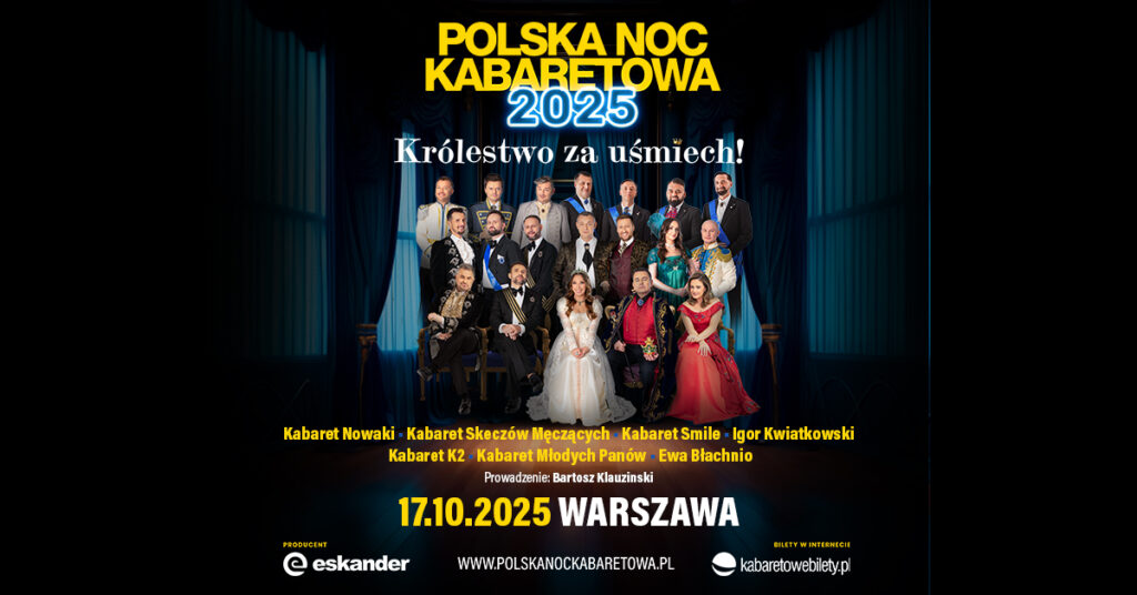 Przygotujcie się na prawdziwą ucztę humoru, bo na naszej scenie wystąpią giganci polskiej sceny kabaretowej: Kabaret Skeczów Męczących, Kabaret Nowaki, Kabaret Młodych Panów, Kabaret Smile, Igor Kwiatkowski, Kabaret K2, Ewa Błachnio! A całość poprowadzi niepowtarzalny Bartosz Klauzinski. Gwarantujemy, że ta królewska obsada rozbawi Was do łez! Zakładajcie korony uśmiechu i dołączcie do nas na największym kabaretowym wydarzeniu roku! Przekonajcie się sami, jak wielką wartość ma uśmiech w Waszym życiu. Polska Noc Kabaretowa 2025 – czekamy na Was! Bilety już w sprzedaży!
