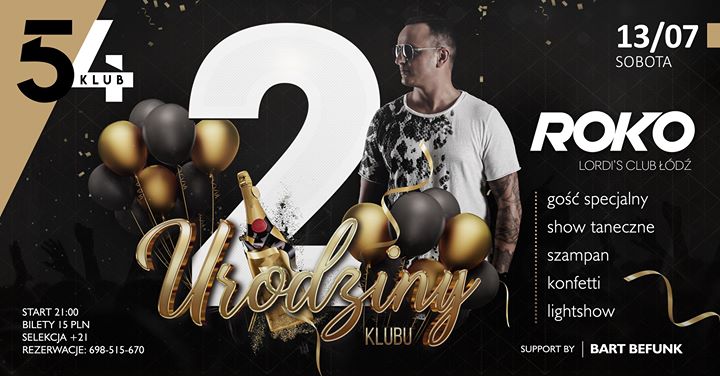 W drugą sobotę lipca zapraszamy na drugie urodziny klubu 54! Zagra dla Was gość specjalny – DJ Roko – wielokrotny uczestnik takich festiwali jak Sunrise, Electrocity, rezydent klubów Lordi’s w Łodzi i Bank Club w Warszawie. Szykujcie się na wysokie muzyczne loty!