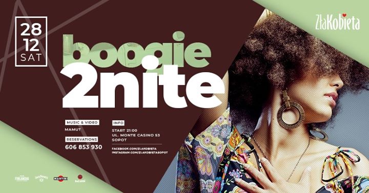 Sobotnia noc oznacza gorączkę. Ale żeby zmierzyć dokładnie temperaturę, musisz koniecznie odwiedzić Złą Kobietę – to tutaj występuje najgorętsza atmosfera w całym Sopocie. Właśnie podczas Boogie2Nite parkiet rozbuja się niczym taktomierz, rozgrzewając salę do czerwoności. Sorry, taki mamy klimat – odpowie Ci DJ Mamut, który odpowiada za to zamieszanie od strony muzycznej, jak i wizualnej (na ekranach pojawią się równie gorące teledyski jego selekcji). Nie ma co lekceważyć objawów. Kiedy myślisz ciepło o weekendzie, potrzeba ci rozgrzewki w postaci dobrej zabawy. Wpadaj więc do Złej Kobiety!