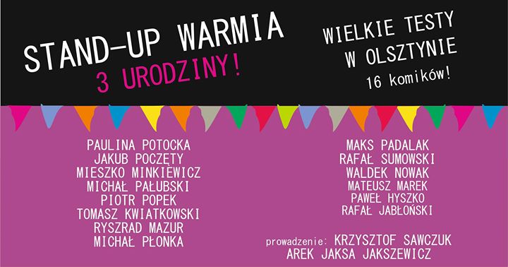 Zapraszamy na 3 urodziny Stand-up Warmia, podczas których wystąpi kilkunastu komików z całej Polski, a nawet reprezentacja początkujących polskich komików z Londynu! Będą testować nowe żarty i Waszą wrażliwość na nie;) Spędźmy razem to święto stand-upu.