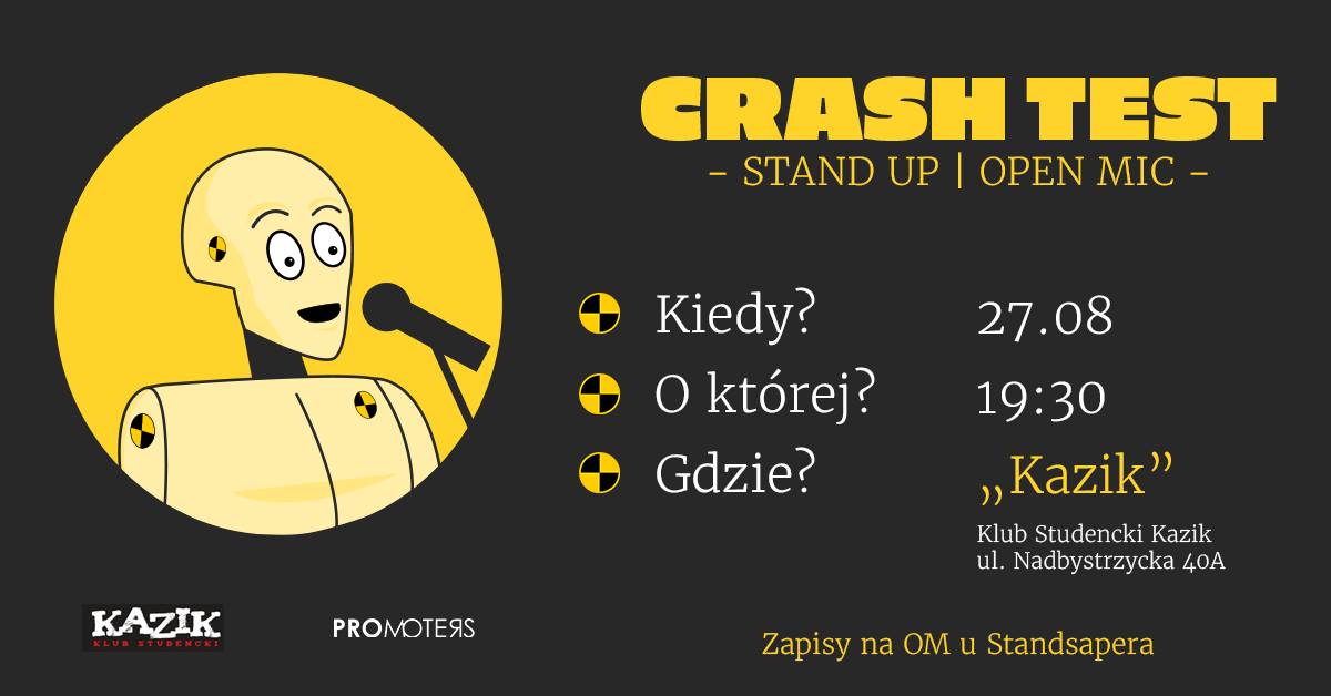 CRASH TEST jest to kolejne wydarzenie z cyklu Open Mic’ów, na których komicy testują swoje żarty, a ich jakość jest weryfikowana przez publiczność.