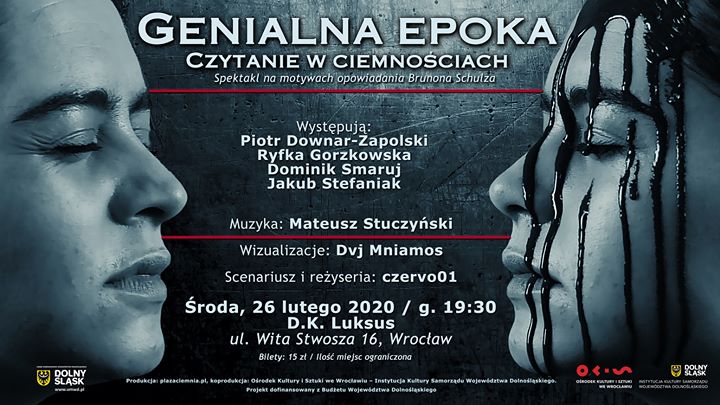 „Genialna epoka” czytana w ciemności wykracza poza świat fikcji, dotykając biografii genialnego autora z Drohobycza. Impresja i fantasmagoria przeplata się tu z codziennością i zdarzeniami realnymi. To kameralny spektakl o epizodzie z życia nastoletniego Józefa i dojrzałego Bruna. Wyobraźnia staje się schronieniem, kiedy nadciąga mrok.