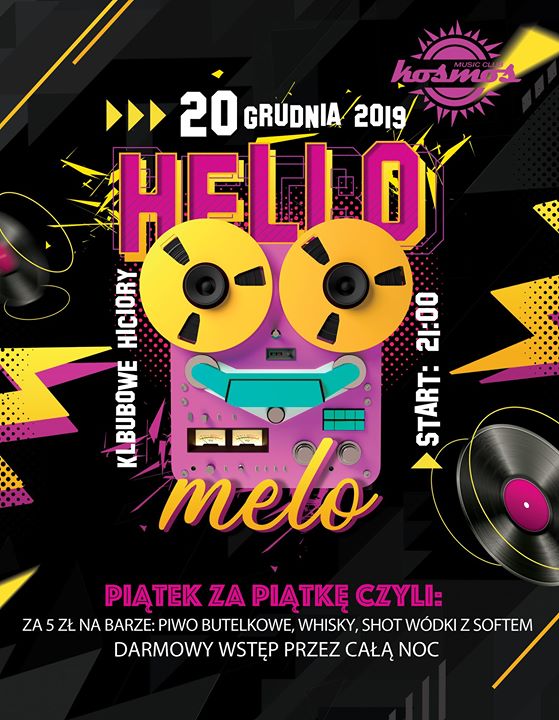 Przedświąteczny piątek to „Hello melo” czyli klubowy melanż na najwyższym piętrze galerii Kosmos. W tą noc LEJEMY ALKO ZA PIĄTAKA (piwo butelkowe Brok, whisky, shot z softem). Do tego DARMOWY WSTĘP na imprezę. Przyjdź, zamów na barze, pij alko za piątaka a potem idź na parkiet, gdzie będą leciały klubowe brzmienia.