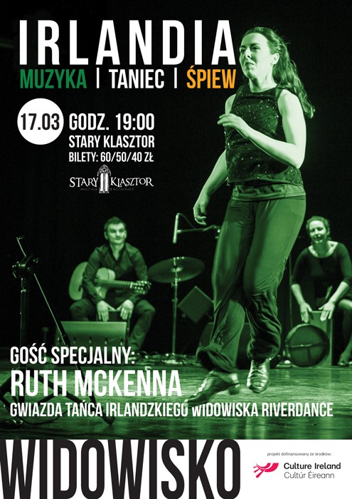 Irlandia, kraj pogodnych, otwartych ludzi, bogatej kultury i wspaniałych krajobrazów. Widowisko IRLANDIA to barwna podróż przez kulturę muzyczną i taneczną zielonej wyspy, od zamierzchłej tradycji po współczesną tradycje tworzoną przez młode pokolenie Irlandczyków. Najpopularniejsza muzyka i taniec ludowy świata w mistrzowskim wykonaniu sprawi że utrzymanie stóp w miejscu będzie nie lada wyzwaniem! Gościem specjalnym będzie Ruth McKenna – gwiazda tańca irlandzkiego widowiska Riverdance! Towarzyszyć jej będą Mateusz Wójcik – twórca widowiska „Usłyszeć Taniec”, tancerze szkoły tańca irlandzkiego Irish Spin oraz irlandzki zespół Macalla Trio.