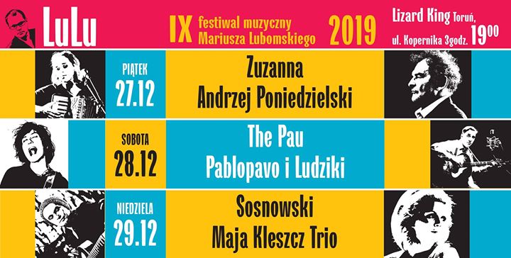 Okres między Bożym Narodzeniem a Sylwestrem też może być elektryzujący! Właśnie wtedy w Toruniu rusza Festiwal LULU Mariusza Lubomskiego. W tym roku wystąpią: Zuzanna i Andrzej Poniedzielski, The Pau, Pablopavo i Ludziki, Sosnowski oraz Maja Kleszcz Trio.
