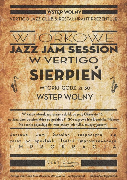 Jazz Jam Session to co wtorkowe spotkanie wrocławskich i nie tylko muzyków jazzowych. To czas, kiedy scena Vertigo otwarta, jest dla każdego, kto pragnie spróbować swoich sił, lub „pobawić” się dźwiękami. Scena należy do artystów a ich spotkania i sztuka, którą prezentują cieszy serce zarówno Vertigo, jak i przede wszystkim Was drodzy Państwo, naszych gości, fanów jazzu. Przecież to właśnie podczas otwartych form kompozycji, powstawały największe światowe dzieła muzyczne. Kto wie, może właśnie na naszych oczach i uszach tworzy się historia. Wszakże zdolnych muzyków we Wrocławiu nie brakuje.