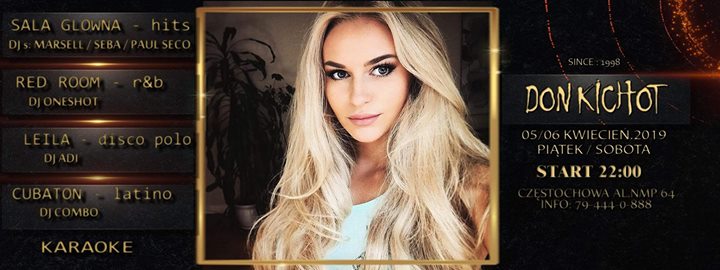 Relaks i miła atmosfera to podstawa każdego weekendu. Chcemy zapomnieć o stresach minionego tygodnia i dać się porwać przyjemnym doznaniom. Wszystkich, pełnych energii do spożytkowania, spragnionych gorącej klubowej atmosfery zapraszamy do Klubu Don Kichot. Czekaja na was najlepsze, kuszace drinki w mega promocyjnych, gorących cenach, przygotowane przez profesjonalną, zawsze czującą imprezę- Ekipę Don Kichota .Przestrzeń wypełnią gorące dźwięki oraz znane i lubiane przez wszystkich muzyczne hity prezentowane przez naszych rezydentów. Przyjazny wystrój i profesjonalna obsługa, stworzą niepowtarzalną atmosferę. Sala Dance, Sala RnB, Sala Latino, Sala Karaoke, Sala Disco Polo – cały lokal do Państwa dyspozycji.