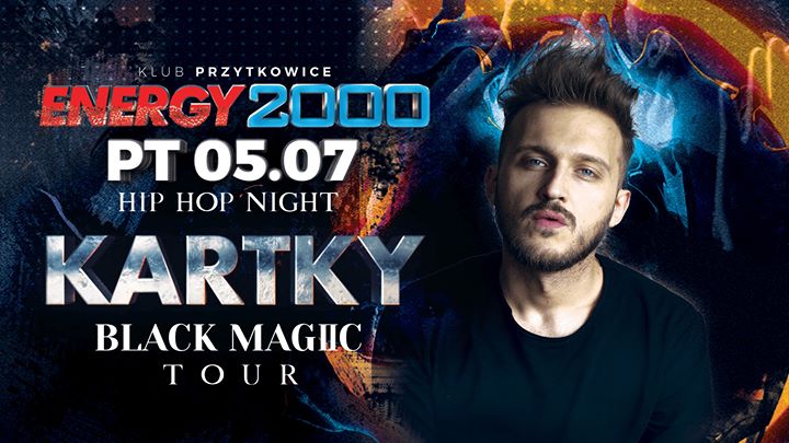W piątek 5. lipca zapraszamy do przytkowickiego Energy 2000, na kolejną imprezę z udziałem gwiazd polskiego hip-hopu. Na Wasze specjalne życzenie na energicznej scenie pojawi się jedyny i niepowtarzalny KARTKY! Twórca hitów: „Outside”, „Dziewczyna Szamana”, „Blackout” i wielu innych. Oczywiście oprócz eksplozji Hip-Hop-owych dźwięków, czeka na Was także moc innych atrakcji i niespodzianek: pokaz pirotechniki scenicznej, wyrzutnie ognia i co2, multilaser-show oraz inwazja naszych firmowych gadżetów!