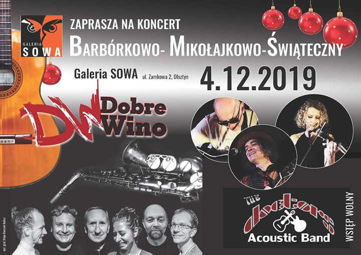 Koncert Barbórkowo-Mikołajkowo-Świąteczny 6 lat temu Kiedy 04.12.2019 19:00 - 22:00 Dodaj do kalendarza Pobierz ICS Kalendarz Google iCalendar Office 365 Outlook Live Gdzie Galeria Sowa Region warmińsko-mazurskie Dobre Wino & The Doctors Akoustic Band Wstęp wolny. No related posts.