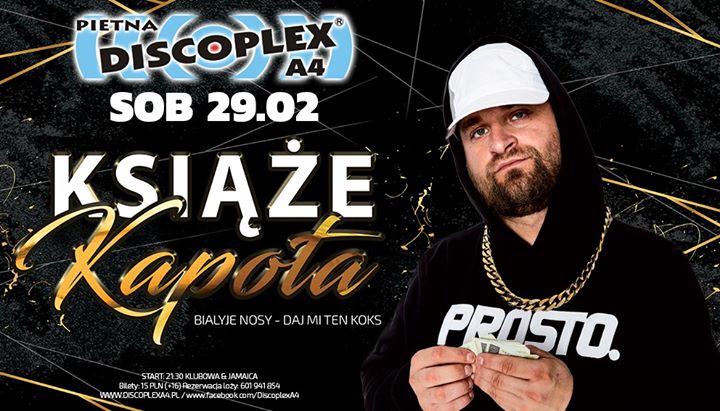 To będzie mocny melanż! Książę 𝗞𝗔𝗣𝗢𝗧𝗔 na scenie! Artysta który nagrywa głośne produkcje z RONNIE FERRARI! MALIK MONTANA! PEJA! SLUMS ATTACK czy TEDE! Już w sobotę tylko w A4!