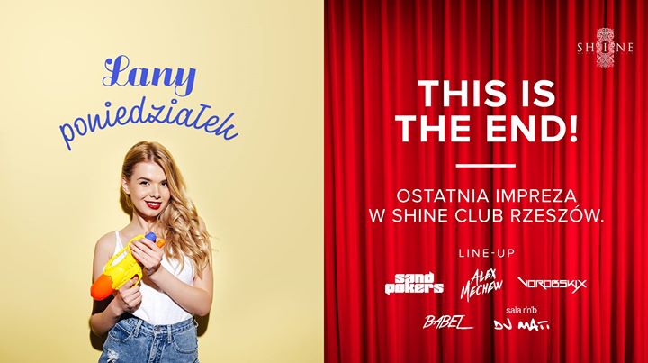 Przyjdźcie i pożegnajcie to miejsce razem z nami <3 LINE-UP: ✘✘✘ MAINSTAGE ✘✘✘ ✰ SandPokers (Shine Residents/Dębica) https://facebook.com/SandPokers/ https://www.mixcloud.com/SandPokers/ https://soundcloud.com/SandPokers/ https://instagram.com/SandPokers/ ✰ Alex Mechew & Vorobskix (Shine Residents/Ukraine) https://facebook.com/alexmechewandvorobskix https://soundcloud.com/alexmechewandvorobskix https://instagram.com/alexmechew https://instagram.com/vorobskix ✰ BABEL (Shine Resident/Rzeszów) https://instagram.com/djbabelofficial ✘✘✘ sala R'n'B ✘✘✘ ✰ DJ Mati (Shine Resident/Rzeszów) ---------------------------------------------- REZERWACJE STOLIKÓW: http://rzeszow.shineclub.com.pl/ ---------------------------------------------- --------------------------------------- WSTĘP: LISTA FB do 22:00 - FREE! pozostali całą noc - 20 zł LISTA FB ZAMYKAMY W DNIU IMPREZY O 20:00 Obowiązuje: door selection! ---------------------------------------