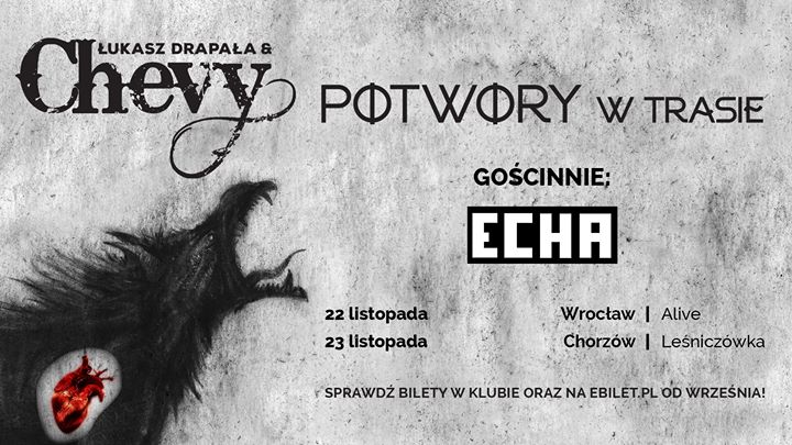 Zapraszamy na „Potwory w trasie” – cykl koncertów promujących najnowszą płytę zespołu Łukasz Drapała & Chevy. W koncercie we wrocławskim klubie Alive gościnny udział weźmie kwintet Echa, który zaprezentuje utwory z debiutanckiego album zatytułowanego… „Echa”. Przygotujcie się na potężną dawkę emocji i zaskakujące muzyczne podróże.