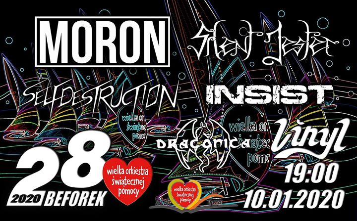 W ten mroźny, styczniowy wieczór, SILENT JESTER wraz z Selfdestruction zabiorą was na ostrą metalową potupankę w szczytnym celu! Po raz kolejny w Klubie Vinyl odbędzie się Metalowy Beforek Wielkiej Orkiestry Świątecznej Pomocy! W tym roku w misji osiągnięcia jak najcięższej puszki wspomogą ich dwię, niesamowite kapele: industrialowy INSIST, oraz hardcore’owa maszyna M.O.R.O.N.
