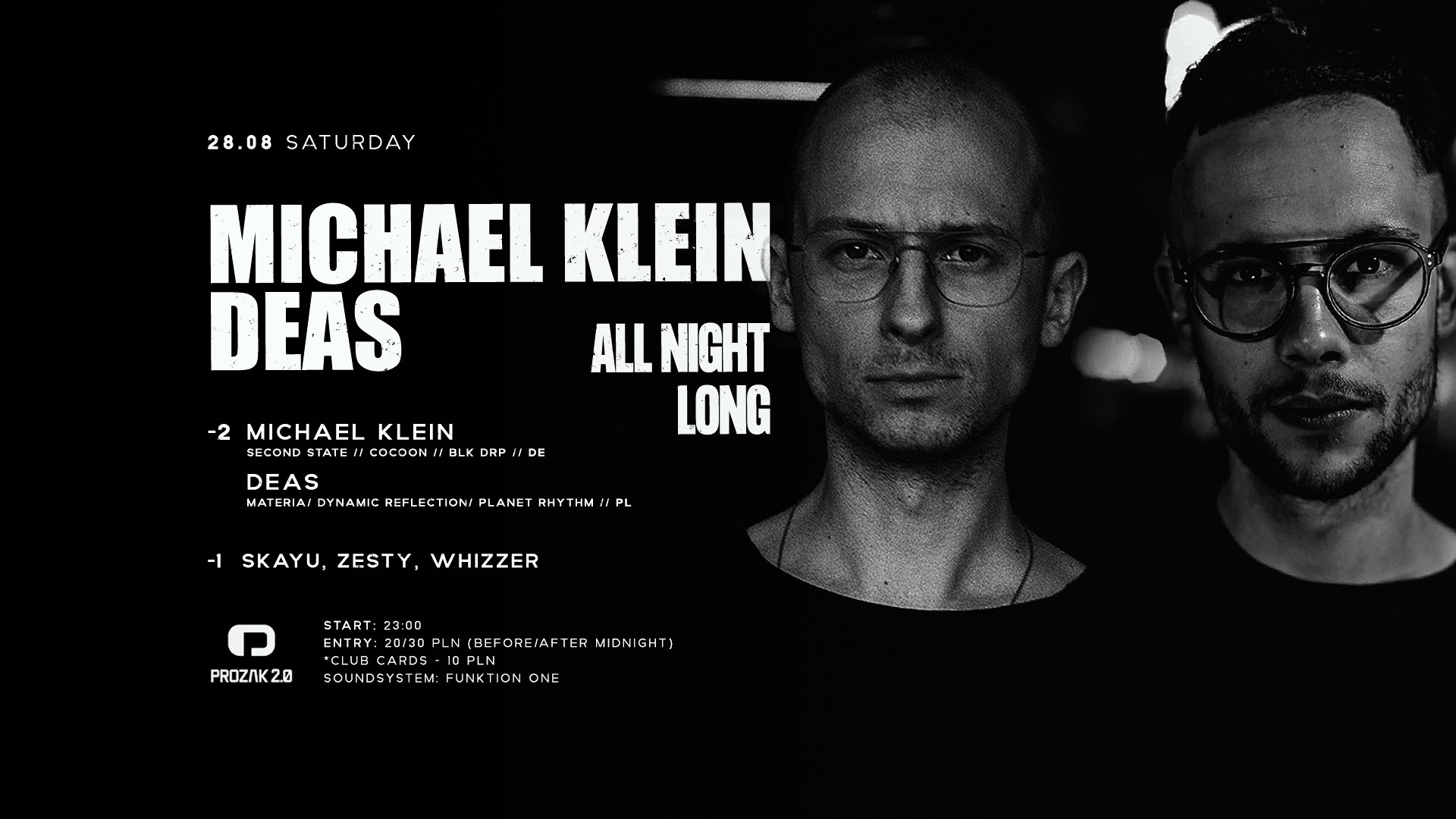 Michael Klein oraz Deas czyli reprezentanci m.in. berlińskiego labelu Pan-Potów „Second State” powracają w mury 2.0, tym razem w formule All Night Long! 🤯 Przygotujcie się na potężną dawkę czystego techno oraz sprawdźcie czym ten duet zaskoczy nas podczas podróży aż do rana!