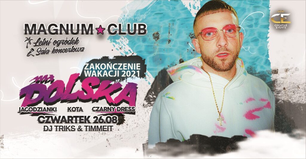 Czas na grube i jedyne takie zakończenie WAKACJI 2021 w MAGNUM! 🔥 Wyjątkowo w CZWARTEK zapraszamy na WAKACYJNE OSTATKI w MAGNUM! 😍 W ten wieczór na sali koncertowej królować 👑 będzie jedyny i niepowtarzalny MR POLSKA! Twórca hitów: „Jagodzianki”, „Kota”, „Czarny dress” i wielu innych! Jak zawsze nie zabraknie dobrych sztosów i mega niespodzianek! ☀ Imprezę nakręcają TRIKS & TIMMEIT. 🤩 Musicie być razem z nami na ostatniej takiej imprezie podczas WAKACJI!