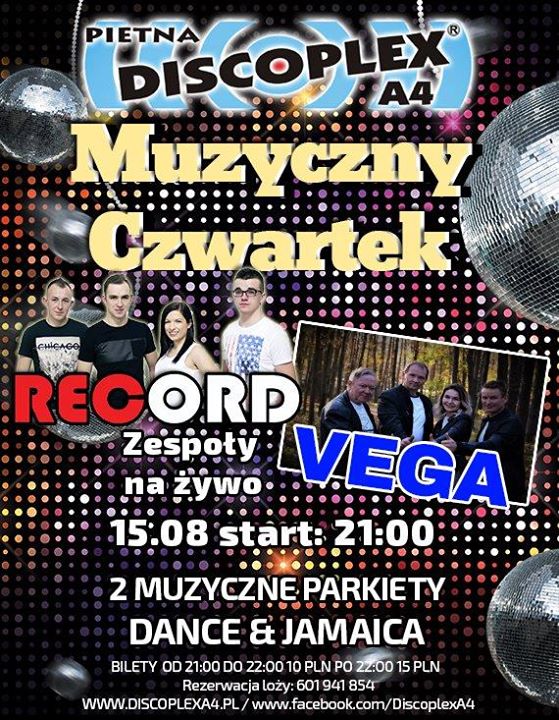 Na żywo imprezę na sali Dance poprowadzą zespół RECORD & VEGA! Gorące hity na sali JAMAICA!