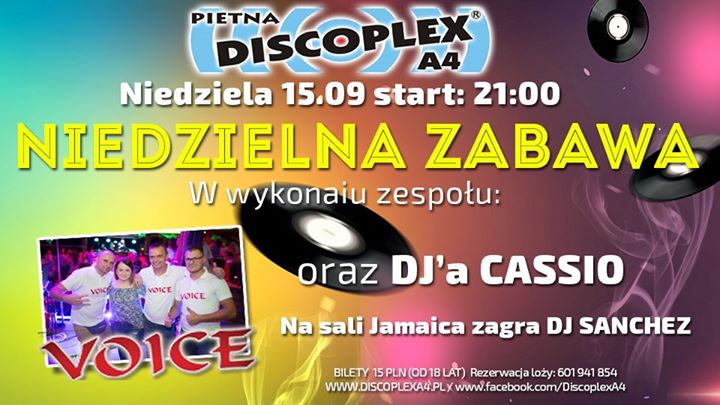 Niedzielna Zabawa w Discoplex A4. Tej nocy wystąpi przed wami na żywo zespół Voice oraz Dj Cassio a na sali JAMIACA zagra DJ SANCHEZ!