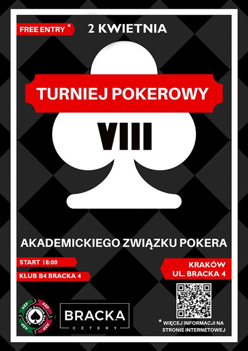 Turniej odbędzie się w klubie B4 Bracka 4 we Wtorek- start godz. 18.00. Prosimy o przybycie w miarę możliwości 20-30 minut przed rozpoczęciem turnieju, w celu rejestracji i zakupu talonu. Gdyby ktoś nie mógł się pojawić punktualnie, to jeśli będzie miejsce, zapraszamy do końca pierwszej przerwy, czyli do około 19:30.Turniej jest darmowy i nie ma żadnej puli nagród! Gramy, aby rozwinąć swoje umiejętności i dobrze się bawić. Aby wziąć udzial w turnieju, podobnie jak dotychczas, prosimy o zakup talonu za 7 zł, który będzie można wykorzystać na barze.