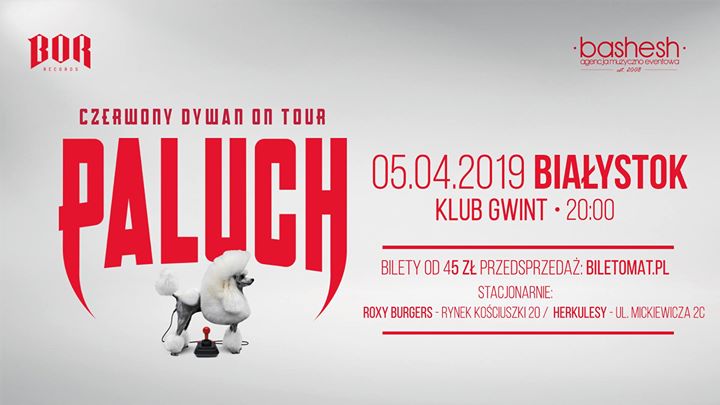 Agencja Muzyczno-Eventowa Bashesh oraz Klub Gwint z ogromną przyjemnością zapraszają na koncert Paluch Oficjalnie, promujący jego najnowszy album „Czerwony Dywan“, który odbędzie się 05.04.2019. w Białymstoku.
