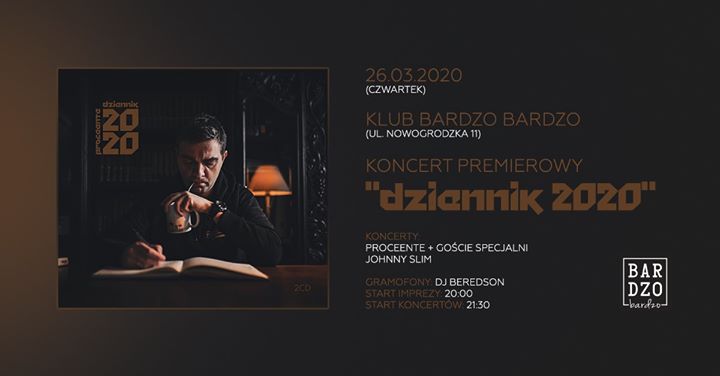 W czwartek 26 marca zapraszamy na koncert premierowy albumu Proceente „Dziennik 2020”, który odbędzie się w stołecznym klubie BARdzo bardzo (ul. Nowogrodzka 11). Oprócz Proceente i gości specjalnych na scenie pojawi się Johnny Slim, który zaprezentuje utwory z solowego krążka „Slimmin’ Around”. Za gramofonami stanie DJ Beredson. Atrakcją specjalną tego wieczoru będzie występ LIVE BANDU Esz + Proceente + StereoTypy.