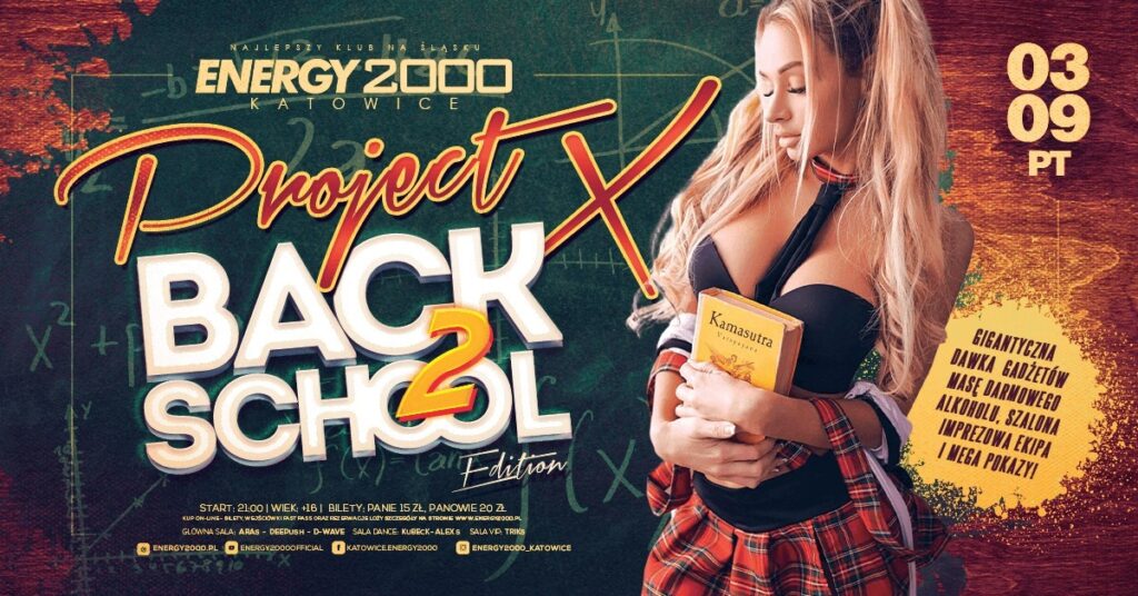 Już w piątek 3. września do Katowickiego Energy 2000, z wielkim hukiem powróci prawdziwy ultra melanż, czyli kultowy „PROJECT X”. Tym razem spodziewajcie się jeszcze bardziej zwariowanej i szalonej wersji. Na imprezę zapraszamy wszystkich, którzy nie boją się porannego kaca i są pewni, że wytrwają z nami aż do białego rana. Oprócz szalonych atrakcji na imprezie czekają na Was: gigantyczna dawka gadżetów, masa darmowego alkoholu, szalona imprezowa ekipa i mega pokazy!