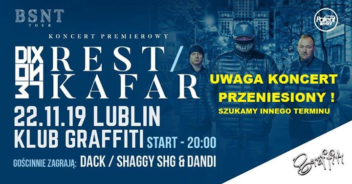 Grupa Patent Event oraz Klub Graffiti mają ogromną przyjemność zaprosić na koncert premierowy REST / KAFAR (Dixon37) w Lublinie w ramach nowej trasy koncertowej BSNT TOUR 2019 !