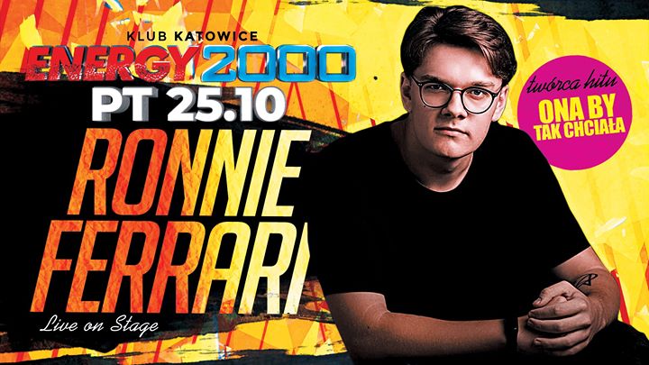 Zapraszamy na jedną z najbardziej wyczekiwanych imprez! W piątek 25 października w katowickim Energy 2000 na scenie pojawi się autor aktualnie najczęściej granego hitu: „Ona by tak chciała”, czyli RONNIE FERRARI! Ponad 61 mln odtworzeń na YT!