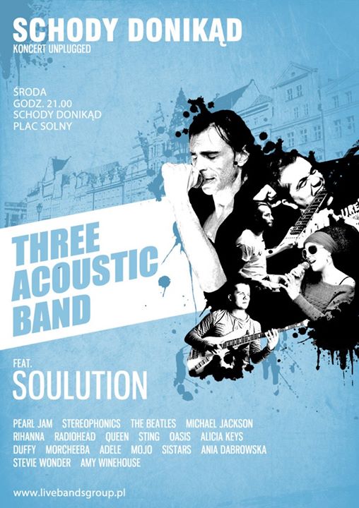Three Acoustic Band i Soulution to grupa przyjaciół wspólnie koncertująca od kilku lat. Dwa niezapomniane wokale, ciekawe aranżacje, duża dawka radości i pozytywnej energii sprawią, ze koncert zapadnie na długo w Twojej pamięci. Zespół porusza się w klimatach rock, pop, soul grając światowe przeboje począwszy od lat 70-tych jak Queen, Bee Gees, Pink Floyd, The Beatles przez przeboje lat 80-90-tych takich jak Michael Jackson, Sting, u2, Pearl Jam, Macy Gray kończąc na hitach królujących obecnie na listach przebojów np: Amy Winehouse, Adele, Duffy, Kings of Leon.