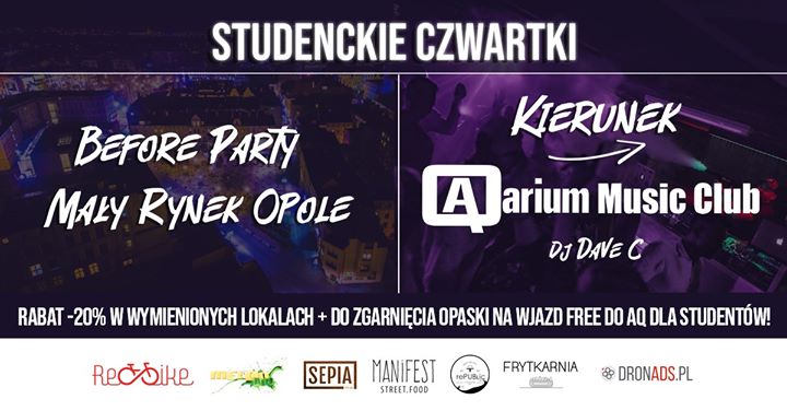 PUB RED BIKE, RePUBlic BAR, Frytkarnia Opole, MELON PUB, SEPIA i Manifest Street Food – W tych lokalach, w każdy czwartek dostaniecie 20% na wymyślne napoje i pyszne jedzenie! 🔥 Dodatkowo otrzymacie darmowe wejściówki, obowiązujące przez CAŁĄ NOC w Studencki Czwartek w AQ! 🚀 Imprezę będzie napędzać nasz rezydent – Dave C! 😎 Nic chyba więcej nie trzeba dodawać! Do zobaczenia w czwartek! 💥