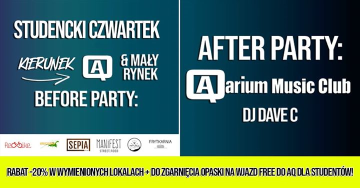 Czwartkową imprezę zaczyna BEFORE NA MAŁYM RYNKU, a potem przenosimy się na WIELKI AFTER DO AQARIUM‼️