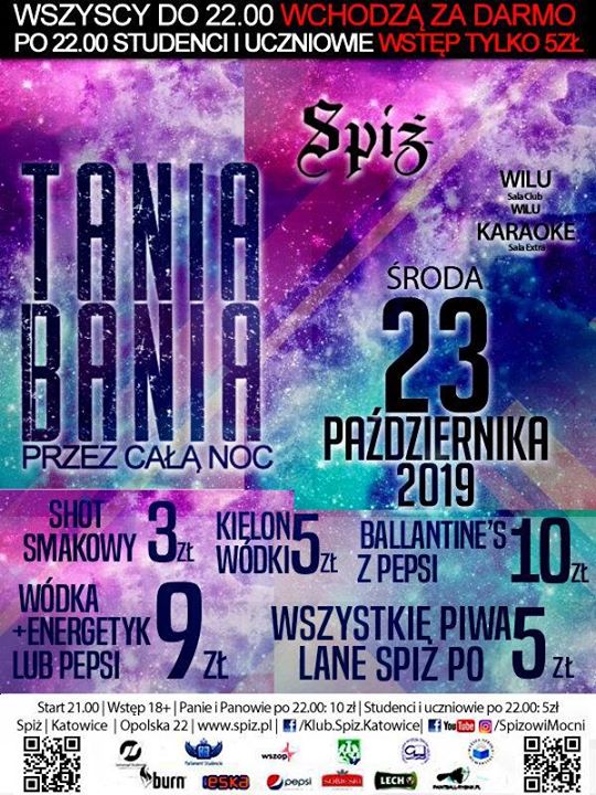 Tania Bania to nowy cykl imprez dedykowanych dla wszystkich tych, którzy chcą się dobrze bawić, a nie chcą wydać zbyt wiele. Jeśli należysz do tego grona to niezależnie czy jesteś studentem czy nie, czekamy na Ciebie od 21.00!