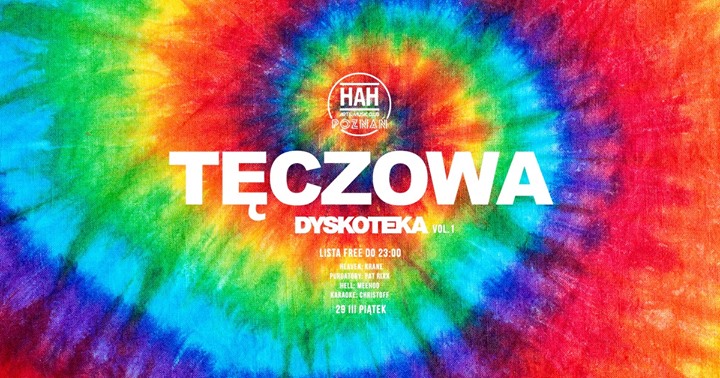 Zapraszamy na pierwszy taki EVENT w Naszych HAH’ach <3 Tej nocy tęczowy świat przeniknie na parkiety. Serwujemy tęczowe przeboje i tęczowe drinasy <3 Dołącz do najkolorowszej imprezy w Polsce! More info soon! A do tego piwo lane HAHOWE 0,5l oraz shot wódeczki smakowej SOPLICY za 5 złociszy. TAKIE PROMO mamy już na stałe do odwołania do północy w piątki. ==================================== ZAGRAJĄ: ==================================== HEAVEN: DJ KRANE ==================================== PURGATORY: DJ PAT RIXX ==================================== HELL: DJ Meehoo ==================================== KARAOKE: Christoff ==================================== START: 22:00 Wstęp 10 zł LISTA FB FREE DO 23:00 / LISTĘ ZAMYKAMY O 19:00