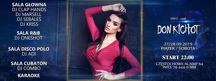 Relaks i miła atmosfera to podstawa każdego weekendu. Chcemy zapomnieć o stresach minionego tygodnia i dać się porwać przyjemnym doznaniom. Wszystkich, pełnych energii do spożytkowania, spragnionych gorącej klubowej atmosfery zapraszamy do Klubu Don Kichot. Czekaja na was najlepsze, kuszace drinki w mega promocyjnych, gorących cenach, przygotowane przez profesjonalną, zawsze czującą imprezę- Ekipę Don Kichota .Przestrzeń wypełnią gorące dźwięki oraz znane i lubiane przez wszystkich muzyczne hity prezentowane przez naszych rezydentów. Przyjazny wystrój i profesjonalna obsługa, stworzą niepowtarzalną atmosferę. Sala Dance, Sala RnB, Sala Latino, Sala Karaoke, Sala Disco Polo – cały lokal do Państwa dyspozycji.