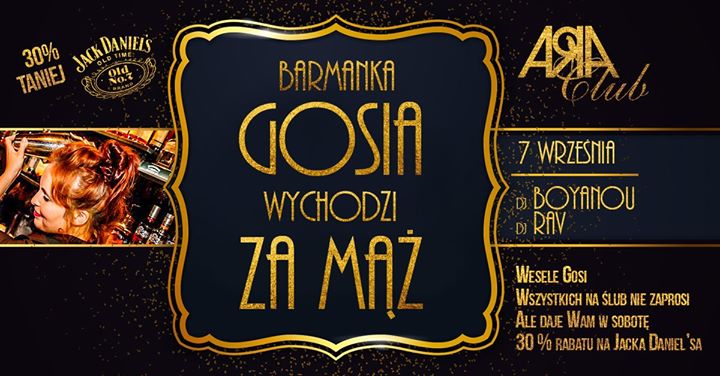 Nasza barmanka Gosia wychodzi za mąż. Zdążyliśmy już ją opłakać, a teraz czas na imprezę. Gosia stawia (no prawie), bo daje Wam 30% upustu na Jacka Daniel’sa. Zapraszamy wszystkich w sobotę, 7 września do Ary !