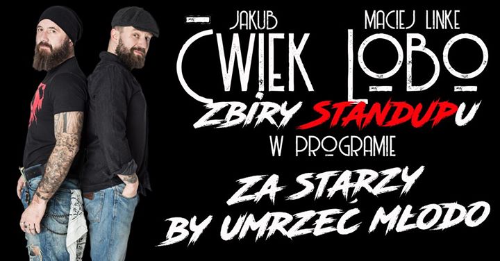 W świecie, który ceni sobie młodość, pogodę ducha i piękno, oni…, no cóż, są. Dwóch brodatych zbirów, którzy otarli się o interesujące życie, przygody, a czasem nawet przytrzymywali drzwi prawdziwej karierze i bogactwu! Nie udało im się dołączyć do legendarnego „Klubu 27”, nie zbawili ludzkości mając lat trzydzieści trzy, ale za to zebrali dość historii, by robić STAND UP przez następnych kilka dekad! Więc po raz kolejny wjeżdżają na scenę z nowiutkim programem! No bo kto im zabroni? Pisarz i wojownik. Krzywonosy Cygan co nie wygląda i szczeciński zabijaka pantoflarz. Łączy ich sfatygowana Honda Civic o imieniu Marlowe, nostalgia za latami osiemdziesiątymi i przyjaźń. Dzieli wszystko inne. Oto oni. Zbiry StandUpu, czyli Jakub Ćwiek i Maciej „Lobo” Linke! Ci dwaj, co są już „Za starzy, by umrzeć młodo!”