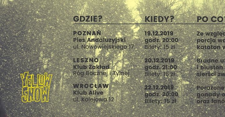 Koncerty Yellow Snow, to rozmazana w niebanalnej psychodelii podróż po gatunkach takich jak rock, progresywny rock, southern rock, blues, funk, country, folk, jazz, a całość ujęta w nieco ironiczej i groteskowej formie w podejściu do tematu szufladkowania w muzyce.